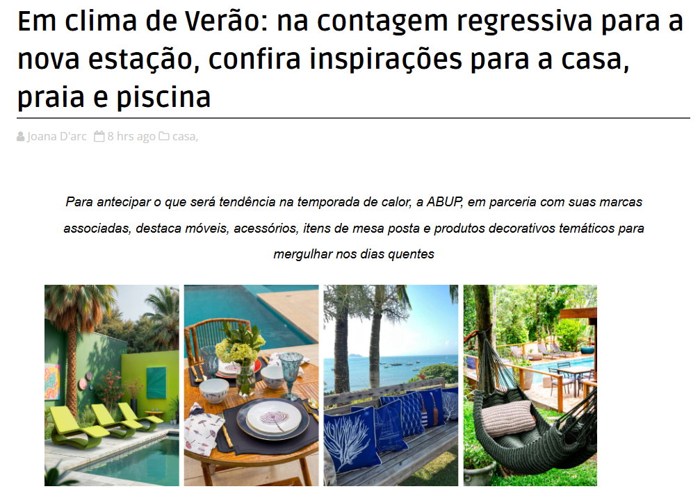 Nessa época, móveis e itens outdoor (para mobiliar áreas externas na cidade, litoral ou campo); utensílios de mesa posta para servir receitas e drinks repletos de frescor; artigos utilitários e decorativos com temática tropical, natural ou marítima (Navy); ente outros produtos são muito procurados e movimentam o varejo. Sem esquecer, é claro, do colorido e dos tons vibrantes que embalam a estação – seja na moda ou no décor.
