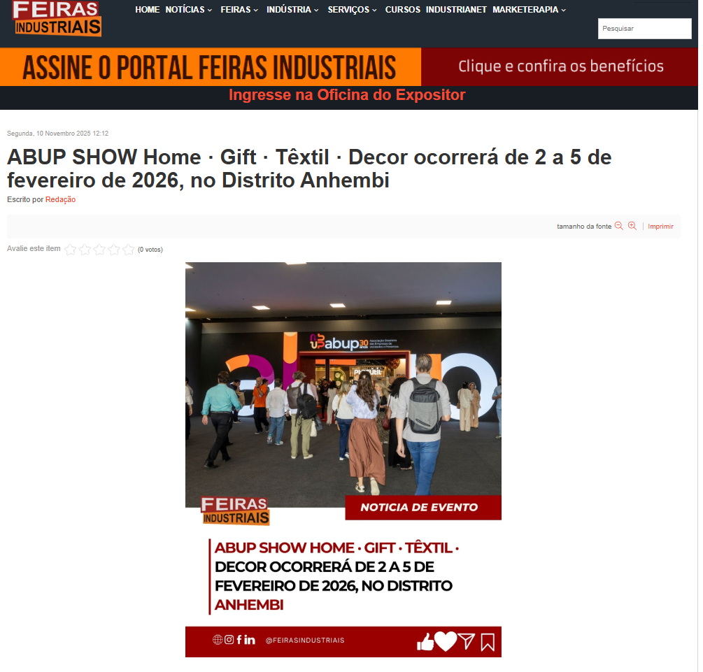 FEIRAS INDUSTRIAIS – ABUP SHOW Home · Gift · Têxtil · Decor ocorrerá de 2 a 5 de fevereiro de 2026, no Distrito Anhembi