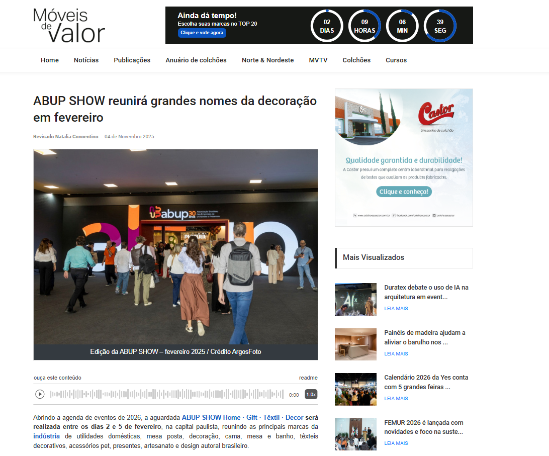 05/11/2025Abrindo a agenda de eventos de 2026, a aguardada ABUP SHOW Home · Gift · Têxtil · Decor será realizada entre os dias 2 e 5 de fevereiro, na capital paulista, reunindo as principais marcas da indústria de utilidades domésticas, mesa posta, decoração, cama, mesa e banho, têxteis decorativos, acessórios pet, presentes, artesanato e design autoral brasileiro.