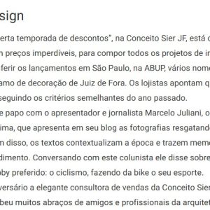 A promoção “Aberta temporada de descontos”, na Conceito Sier JF, está oferecendo itens de qualidade, com preços imperdíveis, para compor todos os projetos de interiores. Em ritmo de conferir os lançamentos em São Paulo, na ABUP, vários nomes de empresários do ramo de decoração de Juiz de Fora. Os lojistas apontam que as tendências para […]