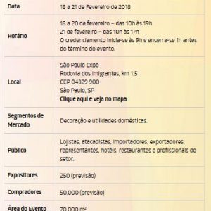 Utilidade doméstica A Abup Home & Gift reune 300 fabricantes de decoração, presentes e utilidades domésticas. Data: 21 de fevereiro Horário: 8h às 20h Local: São Paulo Expo – Rod. Imigrantes, km 1,5. São Paulo Informações: www.abup.com.br Fonte: http://bit.ly/2EY6RYa