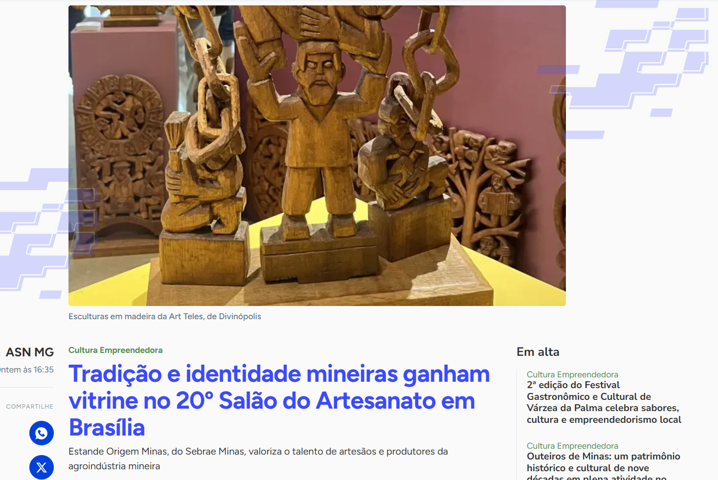 05/11/2025O Sebrae Minas marcará presença no 20º Salão do Artesanato – Raízes Brasileiras, que será realizado entre os dias 5 e 9 de novembro de 2025, em Brasília (DF). Com o estande Origem Minas, a instituição apresentará ao público produtos de onze empreendedores, sendo seis expositores de artesanato e cinco da agroindústria, reforçando a qualidade, a tradição e a identidade cultural do estado. A iniciativa conta com a parceria da Secretaria de Estado de Desenvolvimento Econômico (SEDE), por meio da Diretoria de Artesanato.