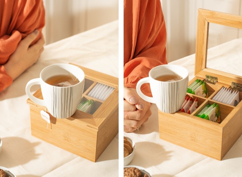 O organizador de chá da linha Sense, da OU, transforma a experiência de servir, para contribuir com uma rotina confortável e de conexão com o lar. Possui 4 divisórias e tampa com visor transparente para facilitar a visualização e organização dos sachês. O bambu promove a sustentabilidade de um material 100% renovável, e traz sofisticação para decorar a sua casa. A linha ressignifica o ato de servir e valoriza os pequenos momentos, trazendo elegância e bem-estar para a casa. Mais informações: www.ou.com.br