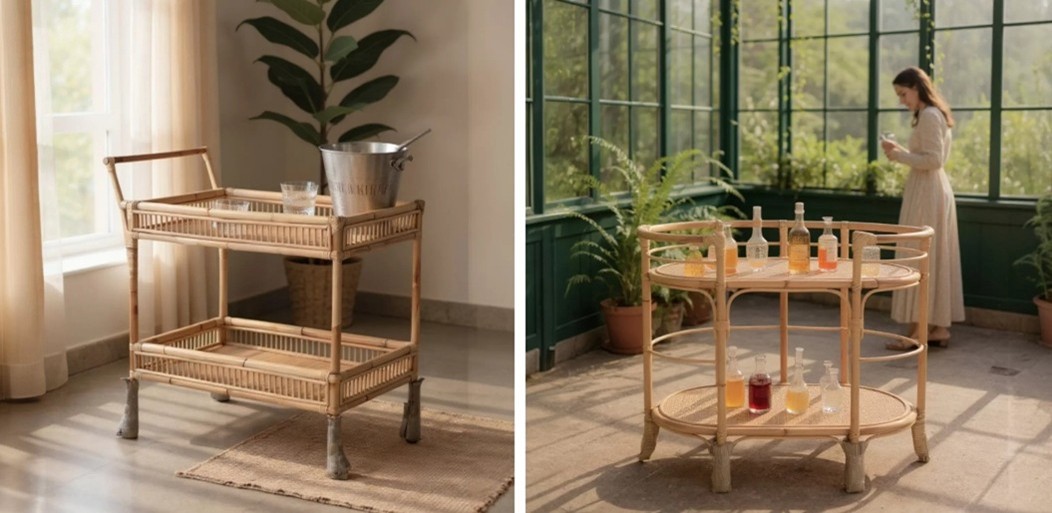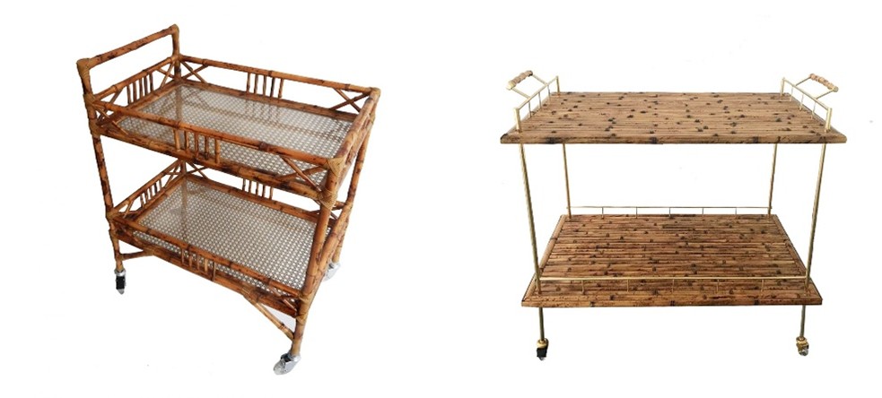 Foto 1 – Carrinho de chá em bambu, vidro e palha dourada. Foto 2 – carrinho de chá com detalhes em metal na cor dourado / Divulgação Sonia Pierry Home e ABUP