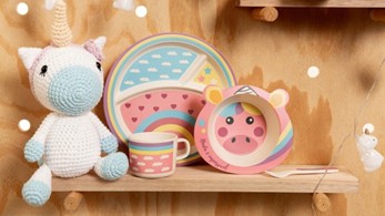 O conjunto de refeição infantil Unicórnio, da linha Bambu, da Oxford é simplesmente encantador! É composto por prato fundo, prato raso, caneca, garfo e colher. A empresa apresenta produtos atóxicos e muito práticos. Feitas com fibra de bambu, as peças são leves e amigas da natureza. (O conjunto não pode ser usado em forno convencional e de micro-ondas). Mais informações: www.oxfordporcelanas.com.br