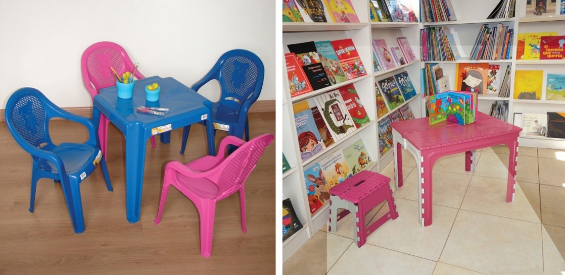 A empresa traz variedade de mesinhas, cadeiras plásticas e organizadores coloridos (com alguns modelos dobráveis e modulares, mais fáceis para guardar posteriormente). As peças versáteis podem integrar brinquedotecas, quartinhos e áreas externas. Mais informações: www.antaresplasticos.com.br