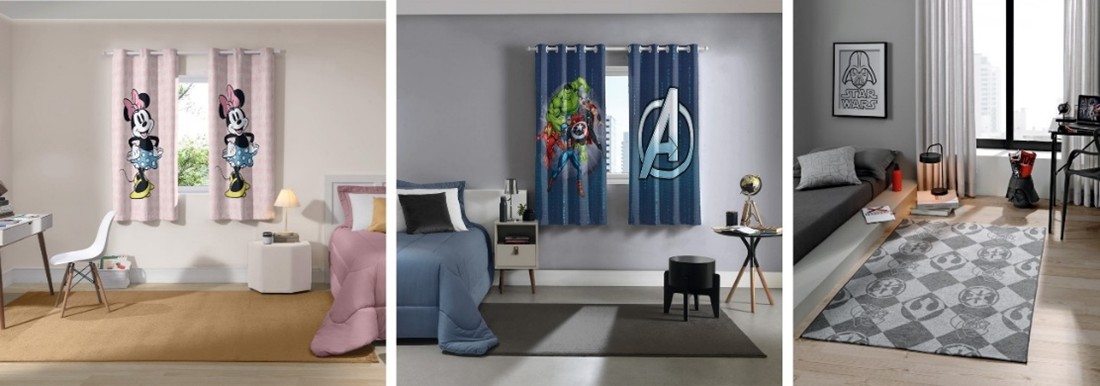 Cortinas Minnie e Avengers, além do tapete StarWars / Divulgação Bella&Co e ABUP
