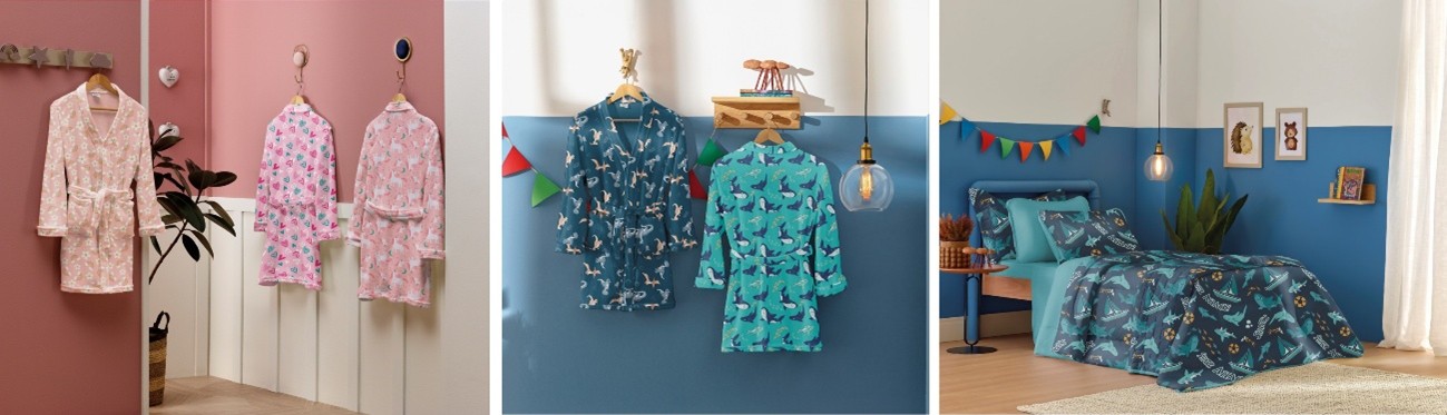 Estampas Cats e Sharks em roupões e jogos de cama / Divulgação Toalhas Atlântica e ABUP