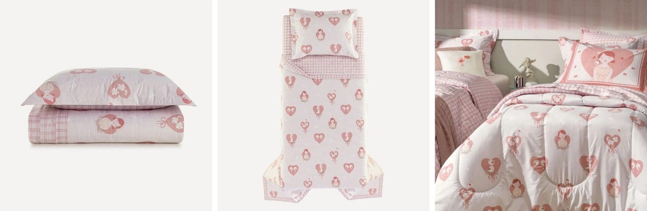 O jogo de colcha 200 fios com porta-travesseiro Ameli, da Karsten, encanta pela riqueza de detalhes. De um lado, a imagem delicada da menina com seu passarinho e corações floridos; do outro, a estampa xadrez rosa. O porta-travesseiro acompanha o conjunto com estampa coordenada e acabamento refinado. As peças são confeccionadas em 100% em algodão. Mais informações: www.karsten.com.br