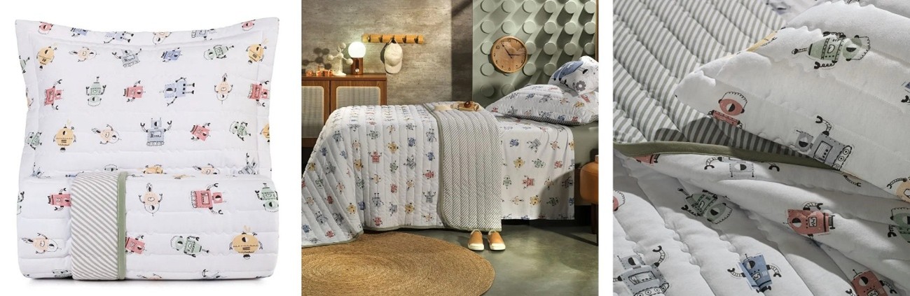 O jogo de colcha Cyberfofos, da Altenburg, leva os pequenos para uma aventura no mundo de robôs divertidos! Com ilustrações coloridas e cheias de personalidade, as peças transformam o quarto infantil em um cenário futurista, estimulando. As peças (colcha e capa de travesseiro) são 100% algodão, com enchimento em poliéster. Mais informações: www.altenburg.com.br